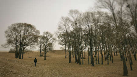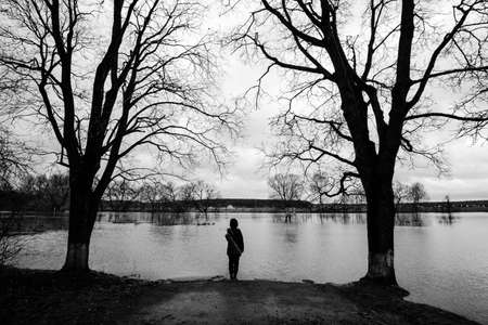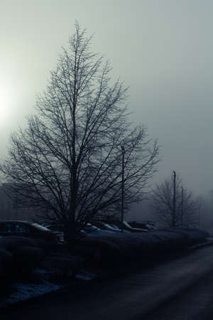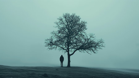 Silhouette of a man standing under a big tree in the fog. Concept of loneliness