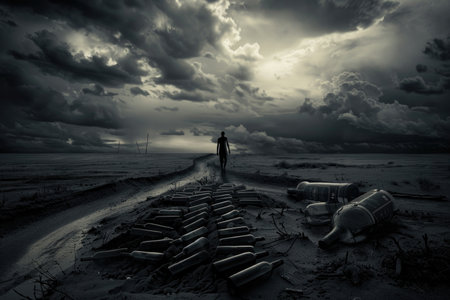 A lone figure walks a desolate path, surrounded by a field of shattered glass bottles, against a backdrop of stormy clouds.