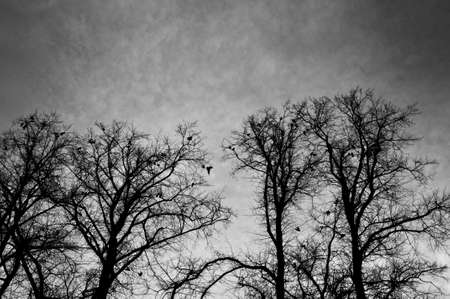 crows flying and roosting in forest trees with a cloudy sky on a winter evening