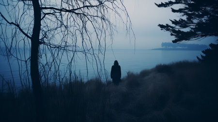 a woman in a coat walks along a path, leading to a body of water, in a darkly romanticism style. the melancholic tone and atmospheric blues create a sense of psychological horror. the photo captures a romanticized depiction of wilderness and coastal scenery, with the provia film adding a touch of nostalgia and depth to the image. ai generated