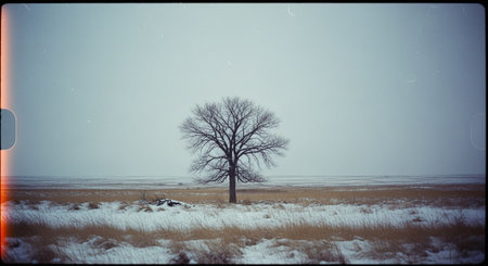 A solitary tree in a snowy landscape, with a gray sky and open fields