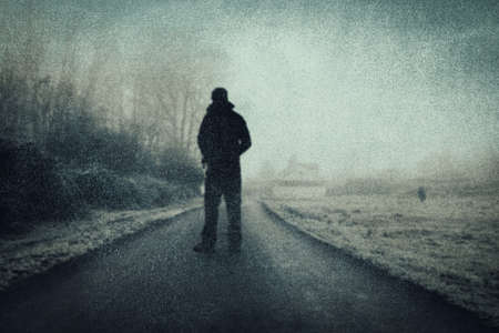 A mysterious figure standing on a road in the countryside. On an atmospheric winters day. With a grunge, textured edit.