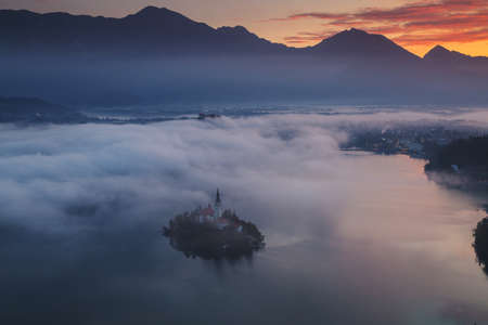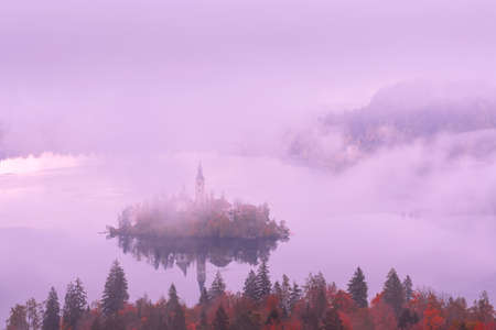 Lake Bled with Church, Slovenia morning pink sunrise view in the fog and autumn trees panoramic background