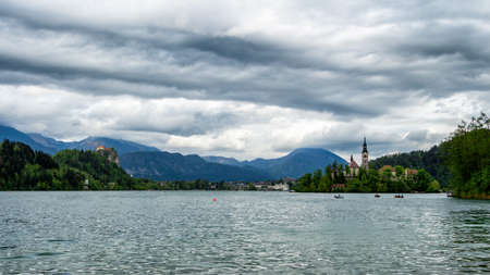 Bled island and boats on Lake Bled with cloudy sky in Slovenia