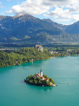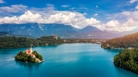 Aerial view of scenic Bled lake, Julian Alps landscape of Slovenia