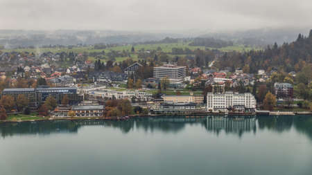BLED, SLOVENIA - OCTOBER, 2019: Bled town with hotels near the lake on a foggy day