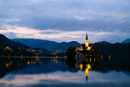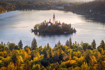Evening autumn view of Bled lake in Julian Alps, Slovenia. Pilgrimage church of the Assumption of Maria on a foreground. Landscape photography