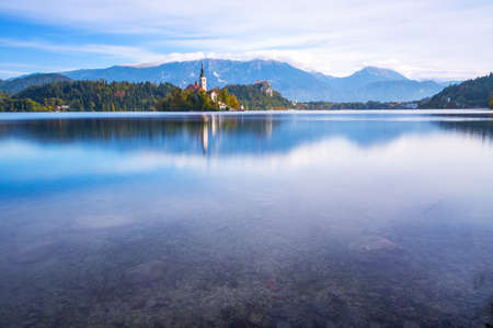 Lake Bled in Slovenia. Church on an island in the middle of the lake. Autumn landscape at dawn. Large resolution photo.