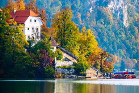Colorful landscape view of and island and Lake Bled with colorful autumn foliage, Slovenia, Europe