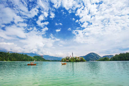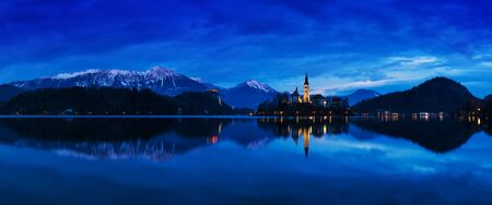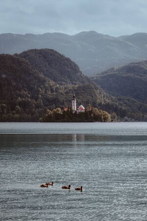 Lake Bled in Slovenia. Beautiful mountains and Bled lake with small Pilgrimage Church. Bled lake and island with Pilgrimage Church of the Assumption of Maria. Bled, Slovenia, Europe.