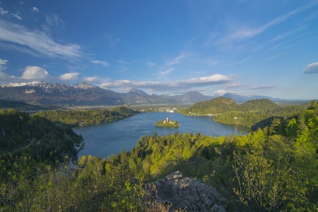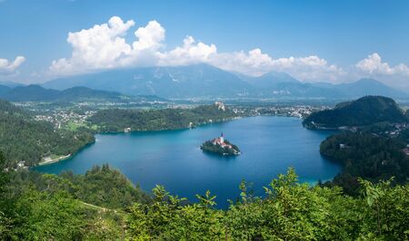 Panoramic view of Lake Bled from Ojstrica Hill, at sunny day with beautiful clouds on background, Slovenia