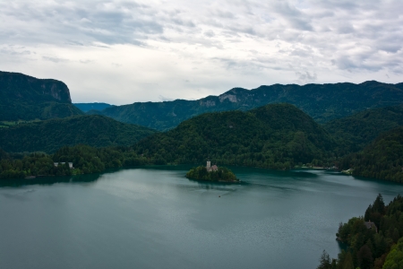 view on Bled lake and mountains