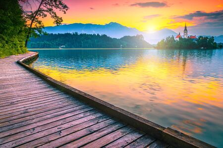 Majestic morning view with small island, church and castle from the wooden promenade. Famous travel and touristic location, lake Bled with Karavanke mountains in background at sunrise, Slovenia, Europe