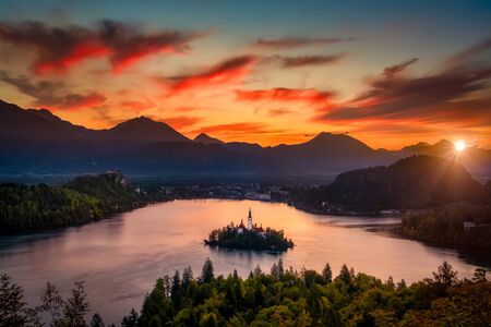 Colorful sunset landscape view of Lake Bled island and church, Slovenia, Europe
