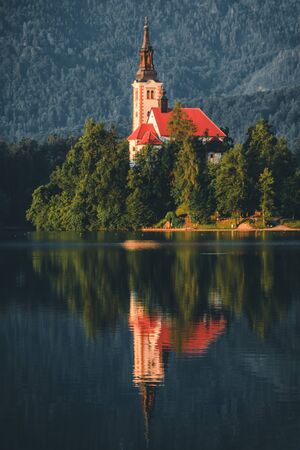 Lake Bled on a calm summer morning with the Assumption of Maria Church on the island, reflecting in the water, surrounded by green landscape and mountains. Selective focus.