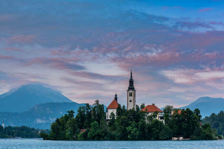 Romantic Bled Lake with Church on Island in Slovenia at Sunset.