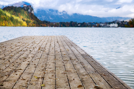 Wooden pier on the Bled lake in Slovenia with famous island and castle on background