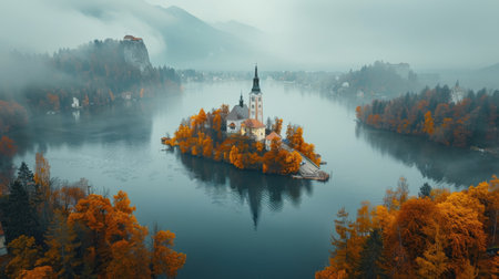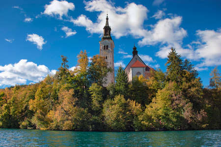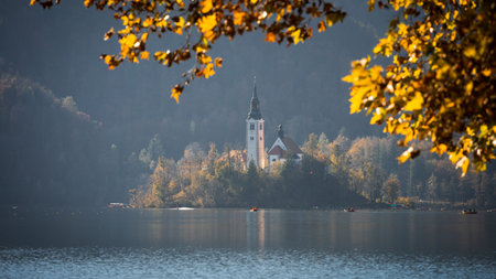 Church build on the island in the middle of a lake framed by autumn colors foliage, Slovenia, Europe