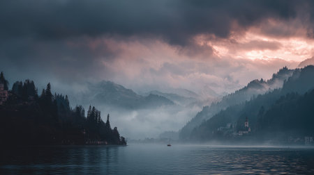 A captivating view of misty mountains reflecting in a tranquil lake, enhanced by a dramatic cloudy sky at twilight, creating a serene and atmospheric landscape.