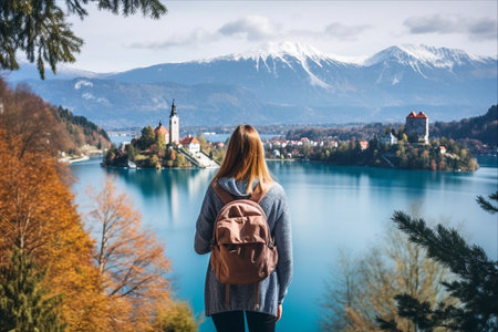 Travel Europe. Tourist person in yellow raincoat looking at Island with Church on Bled Lake in Slovenia. Girl in autumn or winter hiking outfit outdoor on nature. Freedom Adventure Lifestyle Concept.