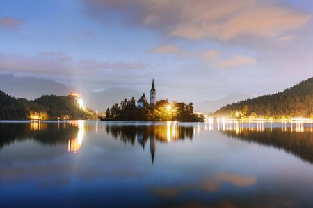 Famous castle in the night on the Bled lake dramatic scene