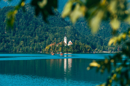 Beautiful morning at Lake Bled and Julian Alps in the background, with natural frame. The lake island and charming church are famous tourist attraction in Slovenia. Miniature tilt shift lens effect