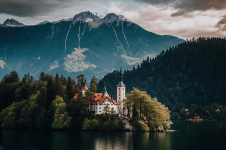 Building in Bled, Slovenia, on a little island surrounded by tall mountains