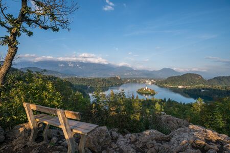 Aerial view of Bled Lake from mountain top with a chair in front, Slovenia