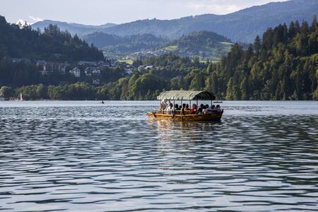 Bled, Slovenia - August 15, 2019: Pleasure boats with tourists on Lake Bled in Slovenia.