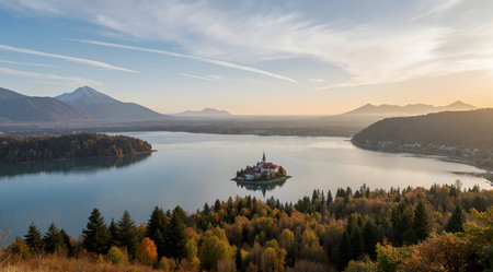 Panoramic photo of lake Bled island with church on a cold hazy foggy early autumn morning from Ojstrica vantage point. Visible scenery and sunrise around the dreamy lake.