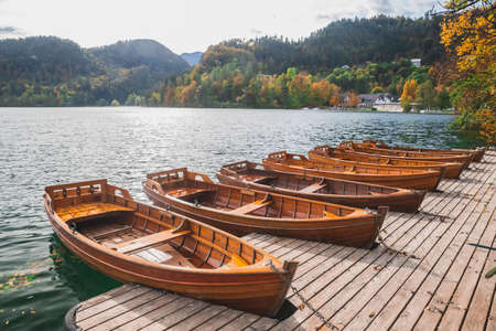 Wooden moored boats on Lake Bled in Slovenia