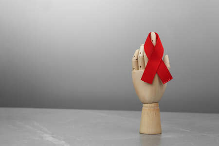 Wooden hand with AID red ribbon in it, on gray marble isolated background. Cancer Control Concept. Symbolizing day of AIDS and HIV