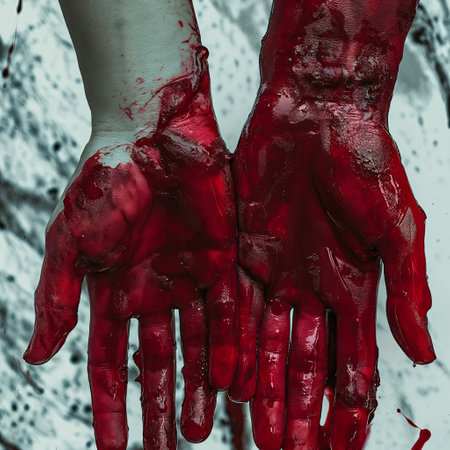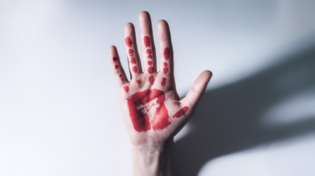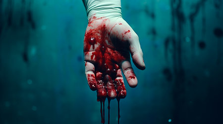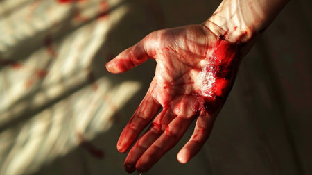A hauntingly vivid image captures a hand covered in red, evoking intense emotions and mystery. Perfect for dramatic storytelling or artistic expressions. Generated A.I.