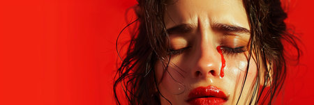 A young woman, eyes closed, with blood on her face, showcasing raw emotion with smeared lipstick and flowing mascara.