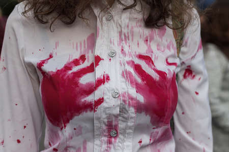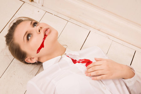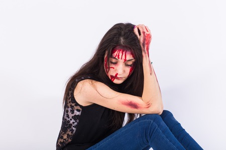 A young female fastening the button with a bloody hand, the victim of violence