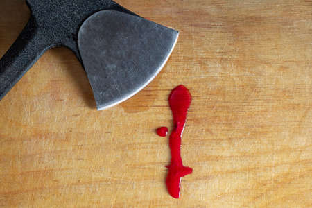 Drops of blood or red juice on an old dirty kitchen chopping board with a hatchet close up. The concept of domestic trauma.