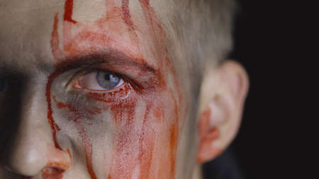 Halloween man portrait with head injury. Guy with dripping blood on his face. Close-up shot of his bloody eye. Man after fight makeup. Attractive model on Halloween. Dark black background