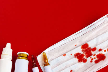 Hand holding mask with red blood stains from cough and sneeze.tuberculosis problem about respiratory.Prevention or defense and protect health care from outbreak of coronavirus.