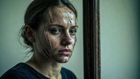 Portrait of a young woman with blood on her face looking at the mirror. Self-awareness concept