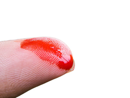 Close up, Bloody injured finger isolated on white background