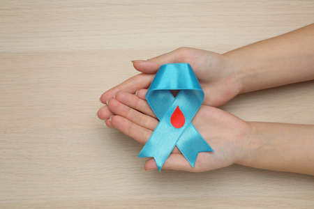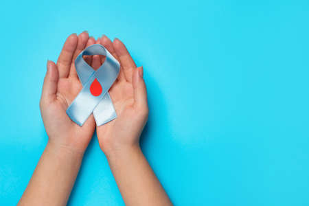 Woman holding light blue ribbon with paper blood drop on color background, top view and space for text. Diabetes awareness