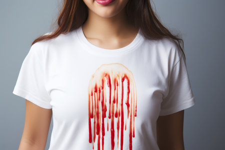 Woman showing red stain on her new fashion tshirt. Wash sauce dirt cloth clean. Generate Ai