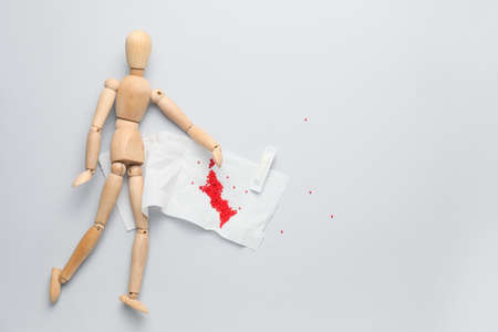 Wooden human figure, suppository and toilet paper with blood spot on light background. Hemorrhoids concept