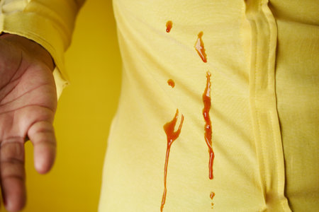 A yellow shirt was stained by spilled ketchup, requiring cleaning to remove the blot