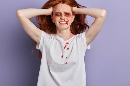 poor girl is fed up of her boyfriends cruelty. close up portrait, studio shot.bitter, violent hatred.abhorrence