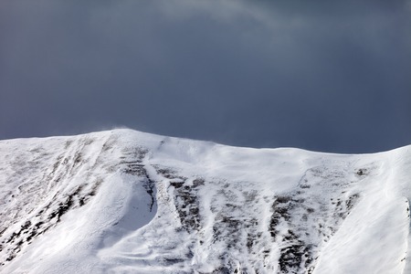 Off-piste slope and storm gray clouds. Caucasus Mountains, Georgia, ski resort Gudauri.