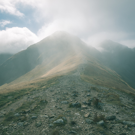 Hikers on a mountain trail with dramatic clouds around and below. Carpathian mountains, Ukraine