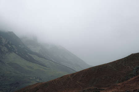 Wonderful alpine scenery with great rocks and mountains in dense low clouds. Atmospheric highlands landscape with mountain tops above clouds. Beautiful view to snow mountain peaks over thick clouds.