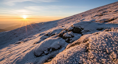 Last sun of the day on snow covered Snowdon Mountain. Landscape, telephoto