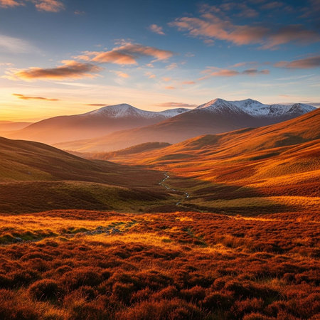 Stunning golden light of sunrise on side of Low Fell in the English Lake District countryside during late Summer